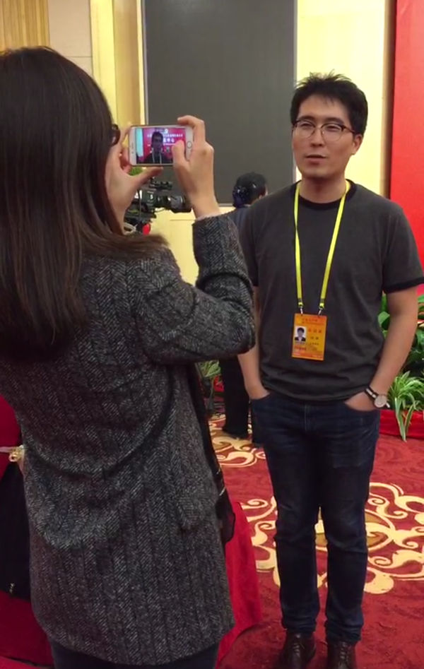 本報新媒體記者接受央廣美女記者的現場采訪。
