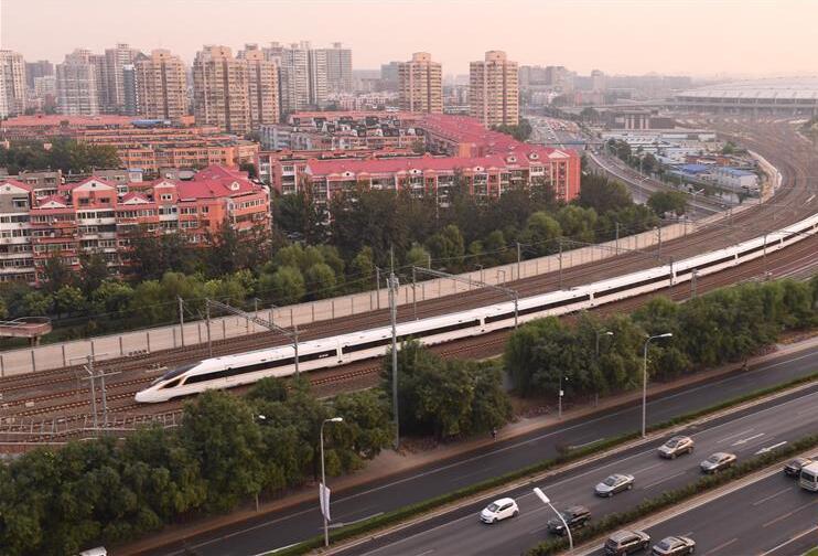 9月21日,一列“复兴号”列车驶出北京南站。“复兴号”350公里时速的正式运营,标志着我国成为世界高铁商业运营速度最高的国家。新华社记者 李贺 摄