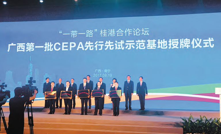 9月19日,「一帶一路」桂港合作論壇在南寧舉行,廣西為粵桂合作特別試驗區等廣西首批CEPA先行先試示範基地授牌。