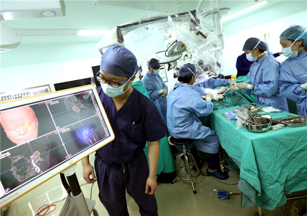 2017年4月8日,上海市浦南醫院主刀醫生在3D導航儀的幫助下實施顱內手術。3D導航儀可提高手術精准性,減少並發症,提升患者生存率。新华社