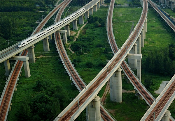 一列動車組列車從河南鄭州東站附近縱橫交錯的高鐵線路中穿過(8月17日攝)。新华社