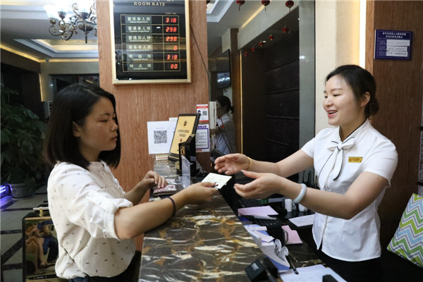 在四川省成都市,來自雲南的大學畢業生梁永蘭(左)在青年人才驛站辦理入住手續(7月15日攝)。成都的人才驛站為“蓉漂”們提供了更舒適的居住環境。新华社