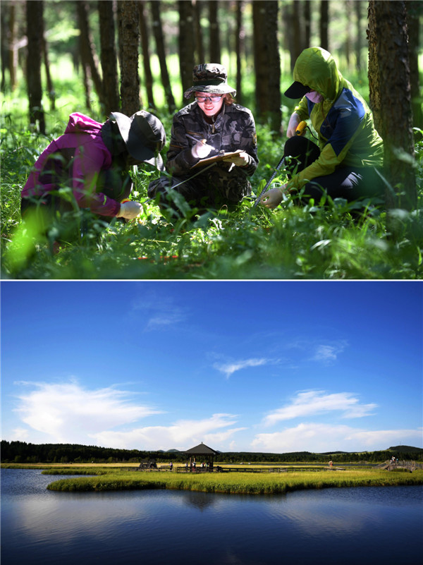 拼版照片:上圖為工作人員在河北塞罕壩機械林場采集數據(2017年7月12日攝);下圖為遊客在塞罕壩國家森林公園七星湖景區遊玩(2017年7月11日攝)。新華社