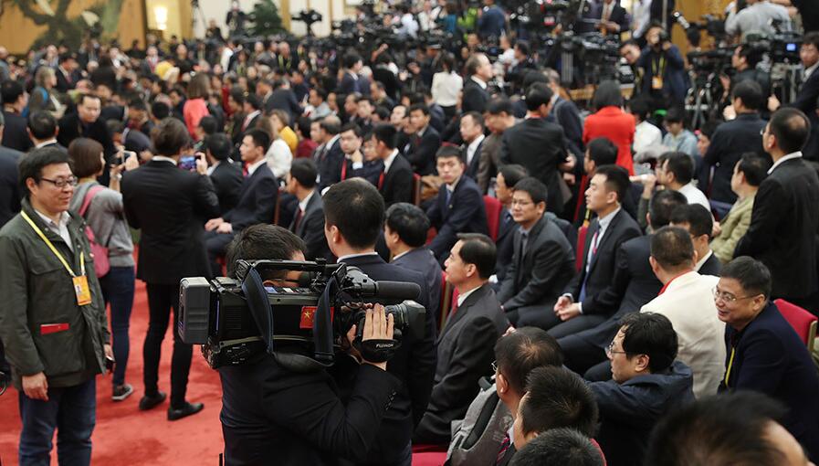中外记者在见面会现场进行准备工作。新华网 翟子赫 摄