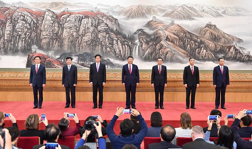 庹震:各位记者朋友,各位来宾,大家好。今天上午中国共产党第十九届中央委员会召开第一次全体会议,选举产生了新一届中央领导机构。我们非常高兴地邀请到新当选的中共中央总书记和各位常委同中外记者见面。现在,让我们以热烈的掌声欢迎总书记和各位常委!