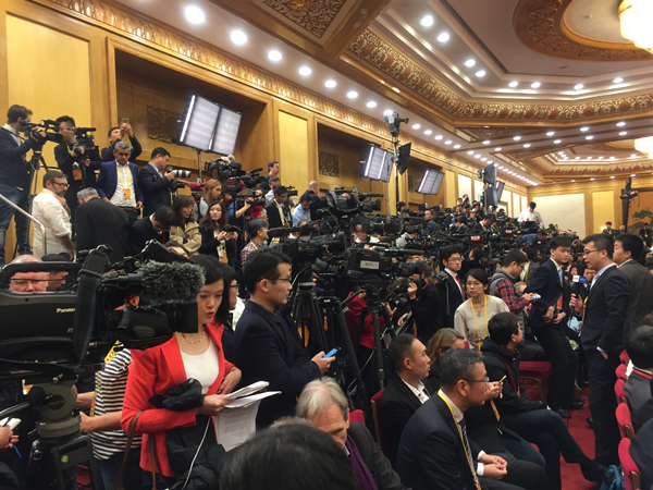 上午10時起,媒體開始放行入大會堂,對行家們來說,一場跑步競賽才剛剛開始。到了東大廳門外,蜂擁而至的記者爭相進門。10點半左右,本報記者進得東大廳,發現大量座位被人用包佔座,最後在大廳靠右手邊角落裏找到一個位子,這時離常委見面還有一個多小時。