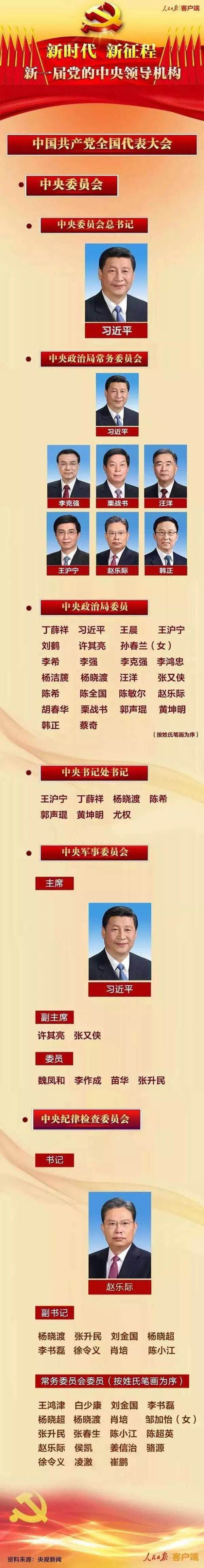 党的十九届一中全会选举丁薛祥、习近平、王晨、王沪宁、刘鹤、许其亮、孙春兰(女)、李希、李强、李克强、李鸿忠、杨洁篪、杨晓渡、汪洋、张又侠、陈希、陈全国、陈敏尔、赵乐际、胡春华、栗战书、郭声琨、黄坤明、韩正、蔡奇为中央政治局委员(按姓氏笔画为序)。