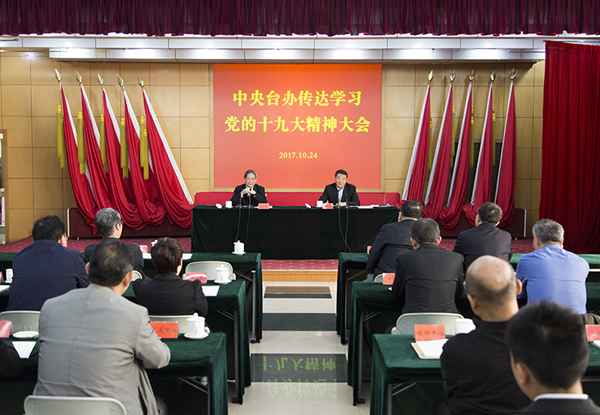 【又訊】中央台辦、國台辦網站昨晚發文指,10月24日下午,中央台辦召開傳達學習十九大精神大會。張志軍主任對中央台辦認真貫徹落實十九大精神作出動員部署時指出,全體對台工作隊伍要深入學習貫徹習近平總書記對台工作重要思想和黨中央對台大政方針和決策部署,堅決維護一個中國原則,堅決反對「台獨」,繼續推動兩岸關系和平發展,紮實推進祖國和平統一進程,為實現「兩個一百年」奮斗目標和中華民族偉大復興的中國夢砥礪奮進,克難前行,不斷作出新的貢獻。
