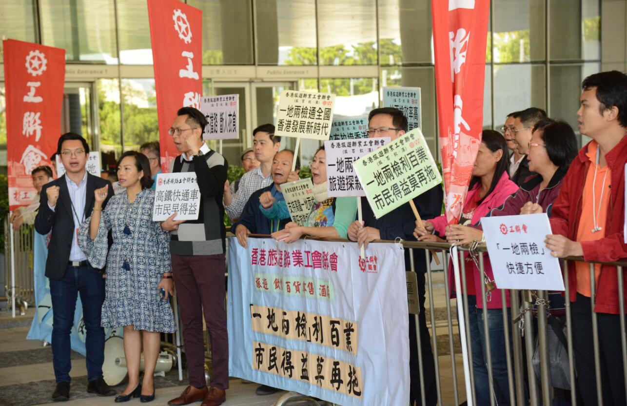 工聯會及多個工會屬會昨日到立法會外請願,既抗議反對派針對「一地兩檢」的「拉布」行動,同時希望本港盡快落實高鐵「一地兩檢」。工聯會認為這有助促進中港兩地的經濟活動,創造就業機會;該會亦指出,國家的鐵路網日益壯大,高鐵總距離長達逾20000公里;該會引伸道,當高鐵香港段正式投入服務后,香港就成為這龐大網絡的一分子;該會點出,高鐵能否發揮其快捷高效的優勢,關鍵在於能否落實「一地兩檢」,而這是符合《基本法》規定,運作上更切實可行。