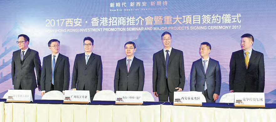 【香港商報網訊】記者郭天琪報道: 「2017西安香港招商推介會暨重大項目簽約儀式」昨日假港島香格里拉酒店舉行,西安市市長上官吉慶、副市長李元、秘書長焦維發,香港貿易發展局西部地區首席代表呂劍,中聯辦經濟部副部長楊文明等出席。招商會上介紹了西安近年來的發展成果、政策優勢,以及西咸新區、曲江新區等地區自身的定位和發展。共有1個戰略合作框架及協議、5個合同項目和22個協議項目成功簽約,包括人工智能技術研發應用、高端酒店、電競產業、文創產業等重點項目,總投資為509.53億元人民幣,場面十分熱烈。