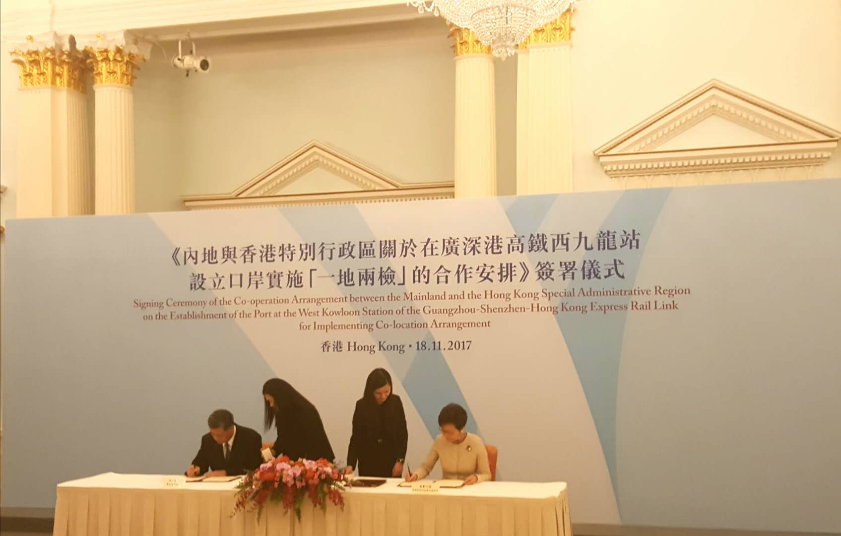 《內地與香港特別行政區關於在廣深港高鐵西九龍站設立口岸實施「一地兩檢」的合作安排》簽署儀式,今午在禮賓府舉行。