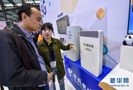 11月19日,参观者(左)在中国电信的展台了解5G基础设施。