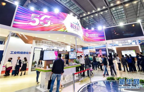 当日,在深圳举行的第十九届中国国际高新技术成果交易会上,各大运营商设立的5G展台吸引参观者的目光。