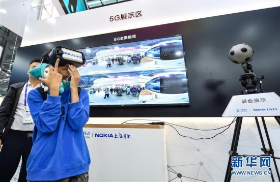 11月19日,参观者在中国移动的展台体验5G全景视频。