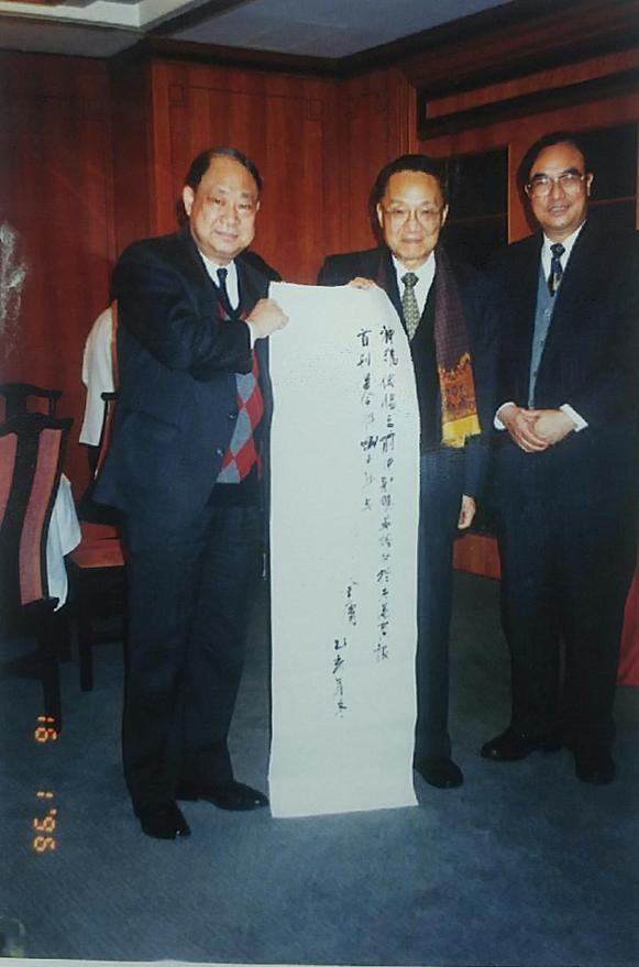 金庸(中)與《香港商報》關系密切。圖為1996年初他為本報題字,與原新華社香港分社副社長張浚生(右)及本報時任社長李祖澤(左)合影。