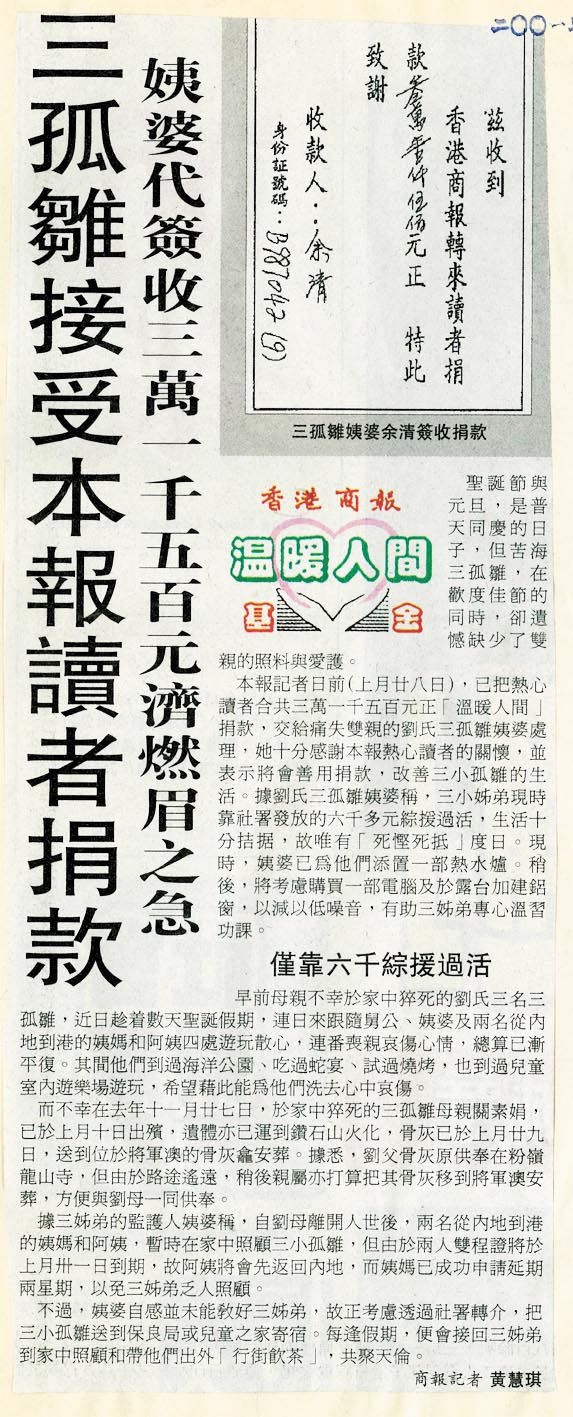《香港商報》設「溫暖人間」基金,將讀者捐款救濟貧困人士解燃眉之急。