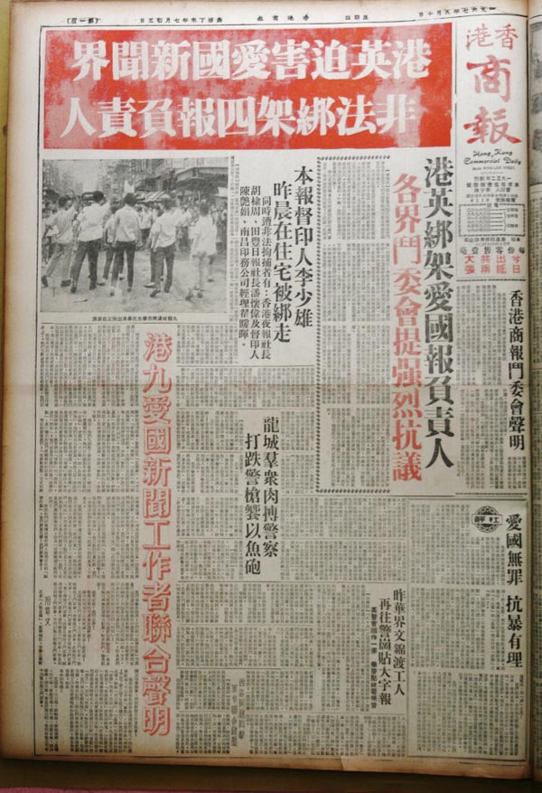 1967年7月30日,本報頭版報道多名愛國記者被港英特務強行帶走拘留的新聞。