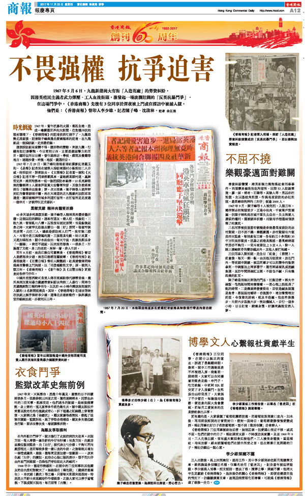 《香港商報》三位同事被政治迫害,無理囚禁,但愛國心堅定不移,威武不屈。他們在獄中的日子,報社照常支薪,不時援助其家屬。及至1969年9月,三人先后出獄,并有盛大歡迎會迎接他們。三人檢查身體后,重返報社,均有加薪,雖未能彌補他們在獄中所受之苦,但在經營日見困難的日子,報社仍顯出一點心意。