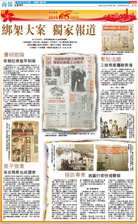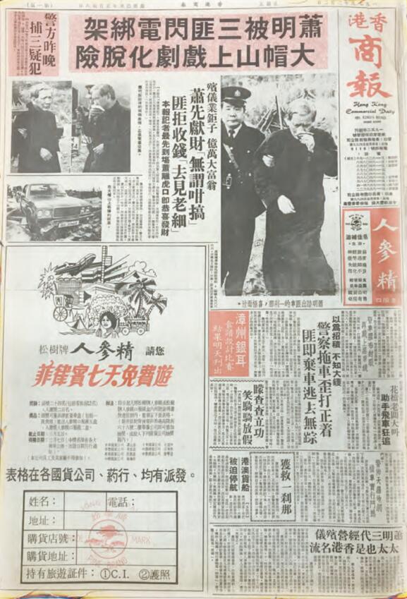 1979年2月2日,《香港商報》頭版報道殯儀業鉅子蕭明被綁架一案,并刊出他獲救后的獨家圖片,贏盡業界赞譽。