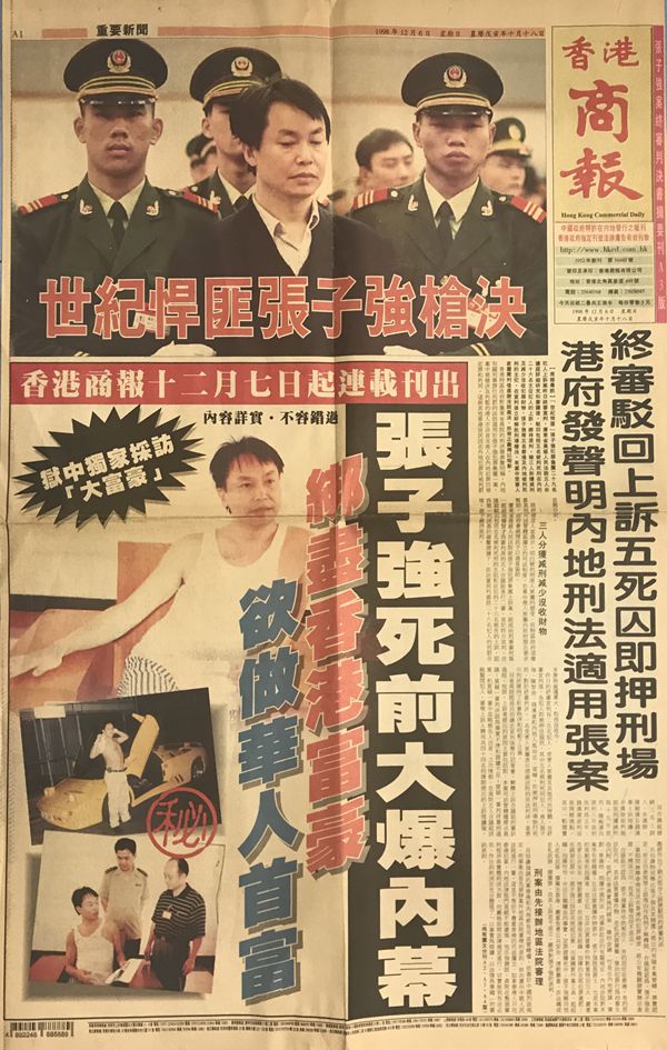 98年12月6日,《香港商報》頭版報道張子強等重犯被判死刑的消息,并預告連載張氏在獄中的獨家專訪。