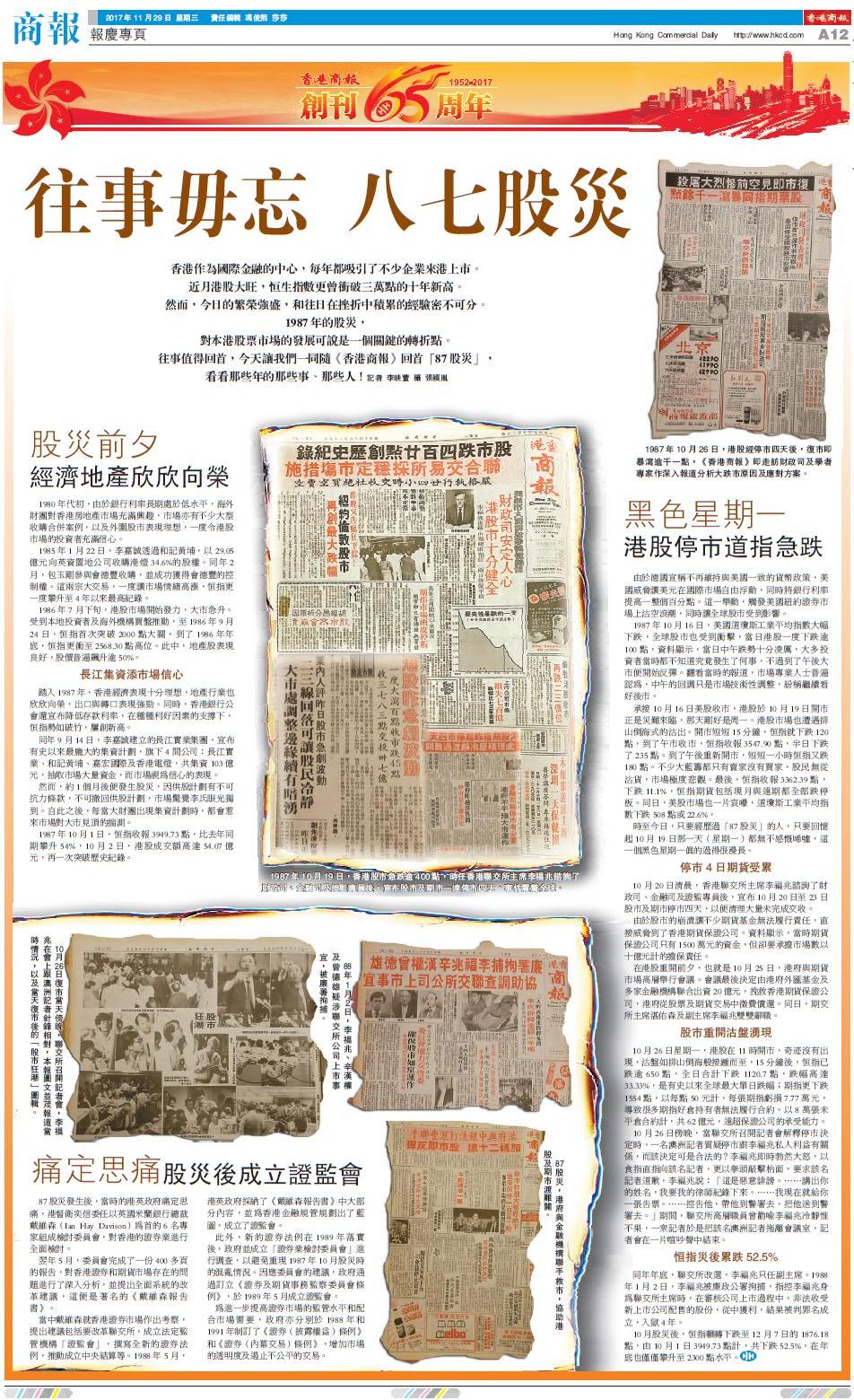 香港作為國際金融的中心,每年都吸引了不少企業來港上市。近月港股大旺,恒生指數更曾冲破三萬點的十年新高。然而,今日的繁榮強盛,和往日在挫折中積累的經驗密不可分。1987年的股災,對本港股票市場的發展可說是一個關鍵的轉折點。往事值得回首,今天讓我們一同隨《香港商報》回首「87股災」,看看那些年的那些事、那些人!