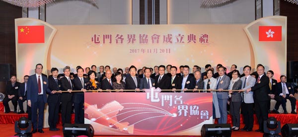 中聯辦新界工作部部長劉林致辭稱,協會的成立標誌着區內愛國愛港力量的大團結、大合作,期望各界領袖同舟共濟,積極支持特區政府和特首依法施政,共同建設美好屯門。劉部長指出,中共十九大的勝利召開,為國家在新時代的發展定下新方略,香港各界應團結一致,把握國家「一帶一路」及大灣區建設等的新機遇。隨着港珠澳大橋的通車,機場至屯門海底隧道的貫通等一系列重大交通設施投入使用,相信屯門將會更好、更快地融入粵港澳大灣區,融入國家發展的大局,為「一國兩制」事業,為中華民族偉大復興作出新的貢獻。