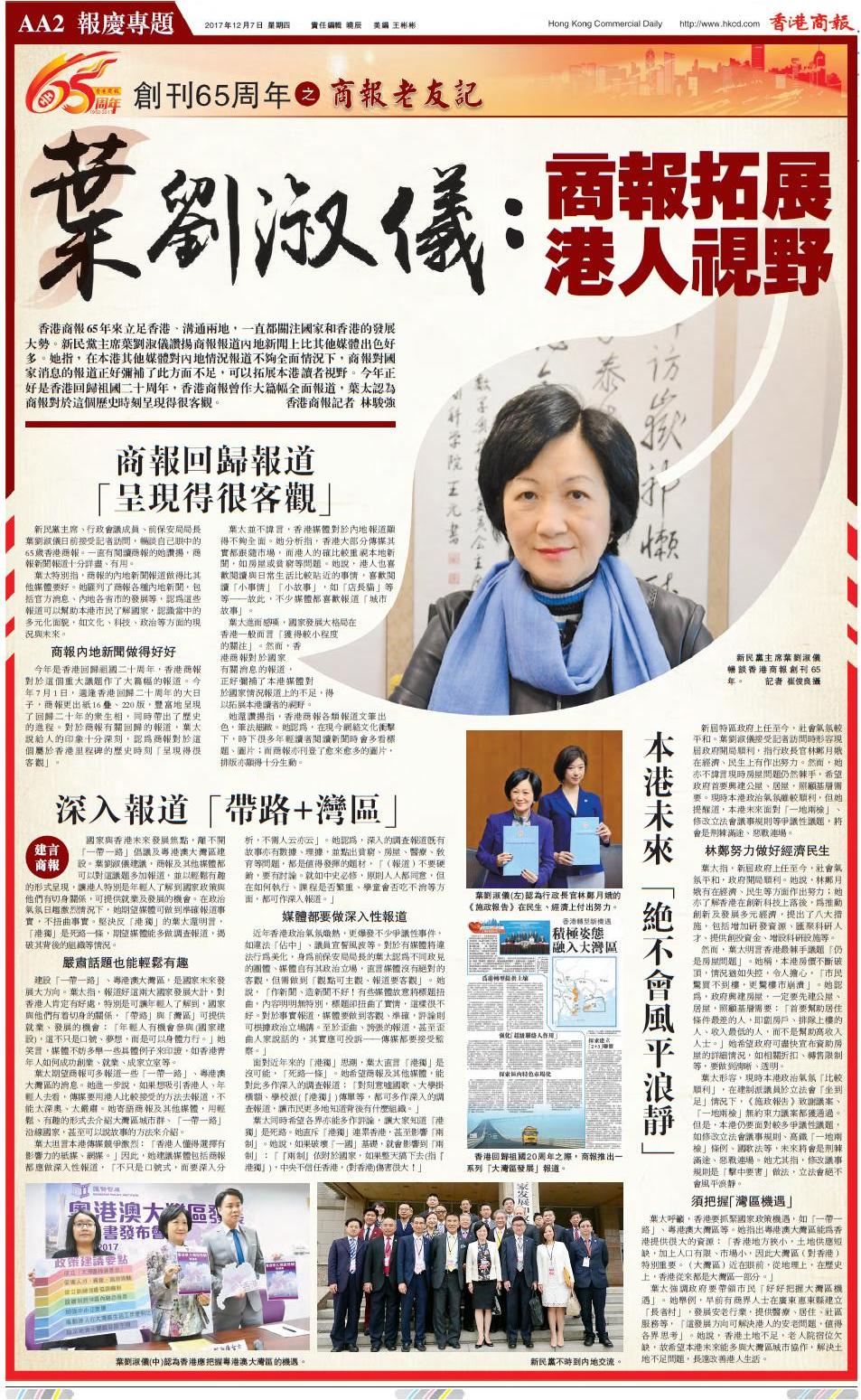 香港商報65年來立足香港、溝通兩地,一直都關注國家和香港的發展大勢。新民黨主席葉劉淑儀讚揚商報報道內地新聞上比其他媒體出色好多。她指,在本港其他媒體對內地情況報道不夠全面情況下,商報對國家消息的報道正好彌補了此方面不足,可以拓展本港讀者視野。今年正好是香港回歸祖國二十周年,香港商報曾作大篇幅全面報道,葉太認為商報對於這個歷史時刻呈現得很客觀。香港商報記者 林駿強