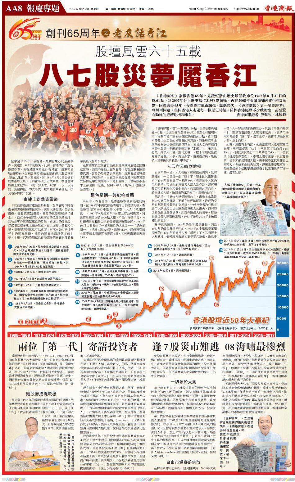 【香港商报网讯】《香港商報》紮根香港65年,見證恒指由歷史最低收市位1967年8月31日的58.61點,到2007年升上歷史高位31958點頂峰,再在2008年金融海嘯沖走恒指2萬點。回顧過去65年,香港股市風雨飄搖、高低起伏,《香港商報》與一眾股壇老行尊風雨同路,偕同香港人走過每一個歷史時刻,陪伴香港經歷不少戲劇性,甚至驚心動魄的經濟危機和事件。香港商報記者 勞佩欣、林展鋒