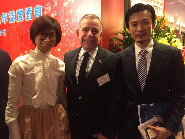 智利駐港總領事龔豪邁(中)與本報助理總編輯胡茵(左))合影