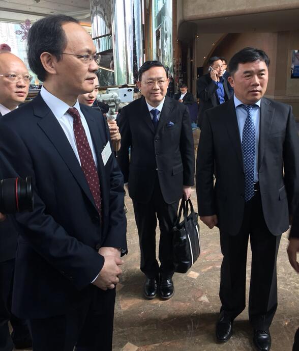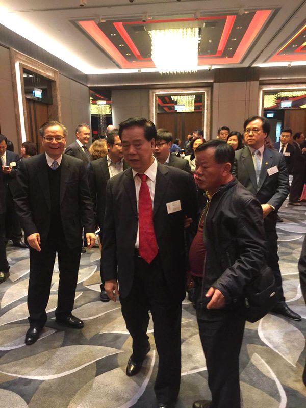深圳市委常委、宣傳部部長李小甘(左三)和香港商報董事局常務副主席黃偉(左二)抵達酒會現場