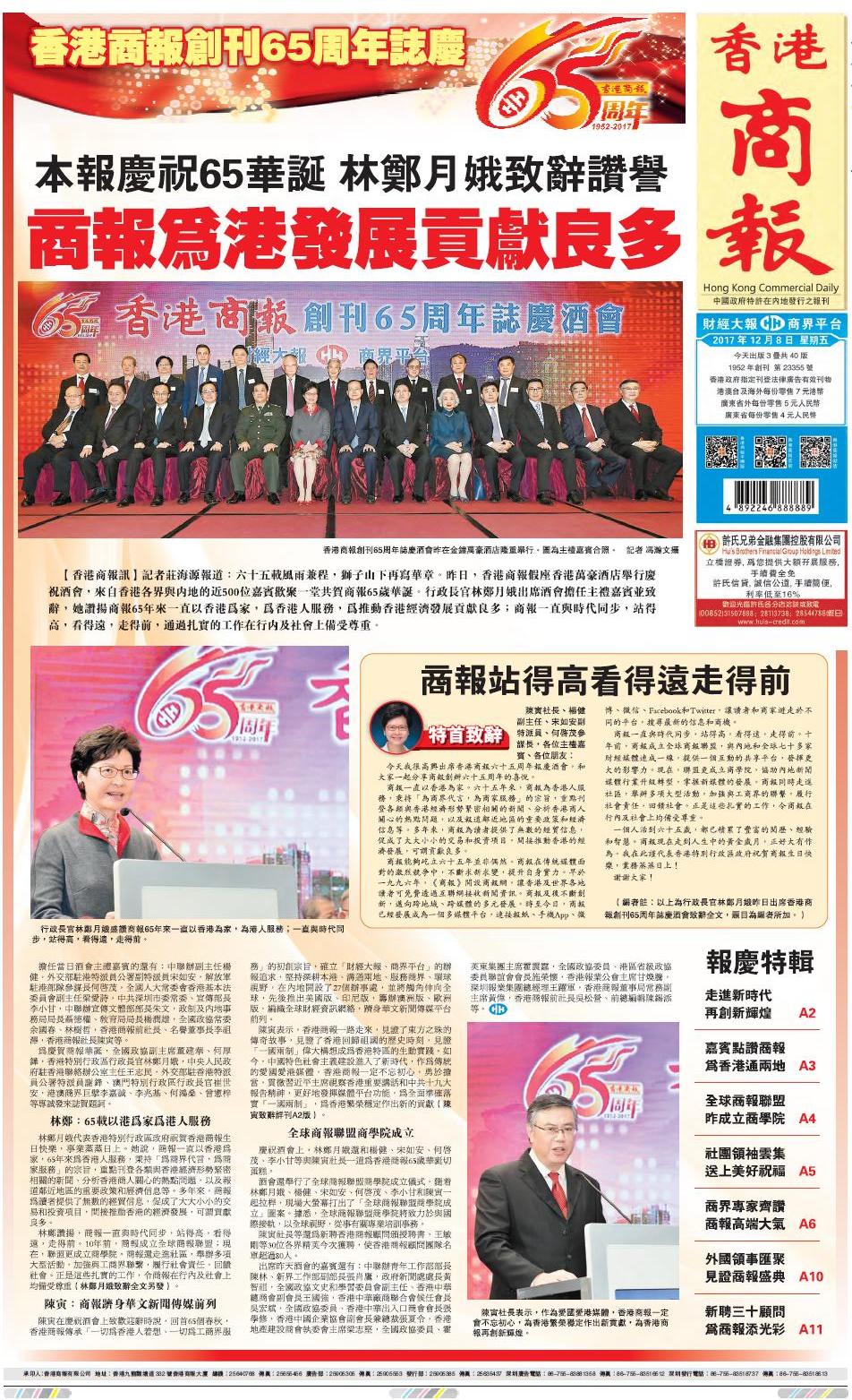林鄭月娥代表香港特別行政區政府祝賀香港商報生日快樂,事業蒸蒸日上。她說,商報一直以香港為家,65年來為香港人服務,秉持「為商界代言,為商家服務」的宗旨,重點刊登各類與香港經濟形勢緊密相關的新聞、分析香港商人關心的熱點問題,以及報道鄰近地區的重要政策和經濟信息等。多年來,商報為讀者提供了無數的經貿信息,促成了大大小小的交易和投資項目,間接推動香港的經濟發展,可謂貢獻良多。
