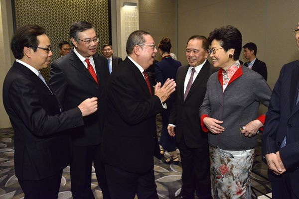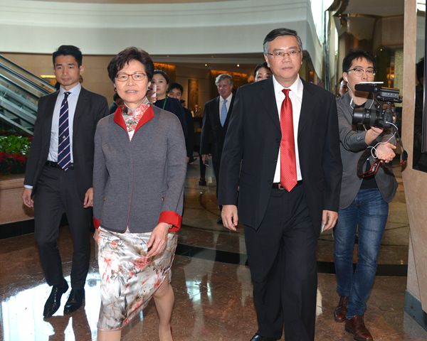 行政长官林郑月娥到临会场,香港商报社长陈寅欢迎。