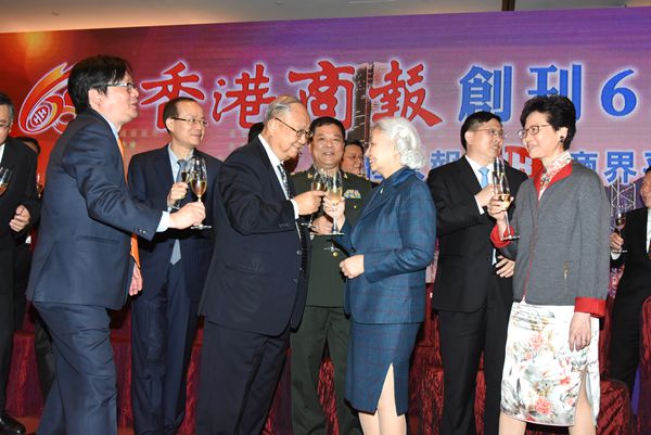 香港商报創刊65周年誌慶酒會昨举行,主礼嘉宾于台上祝酒。