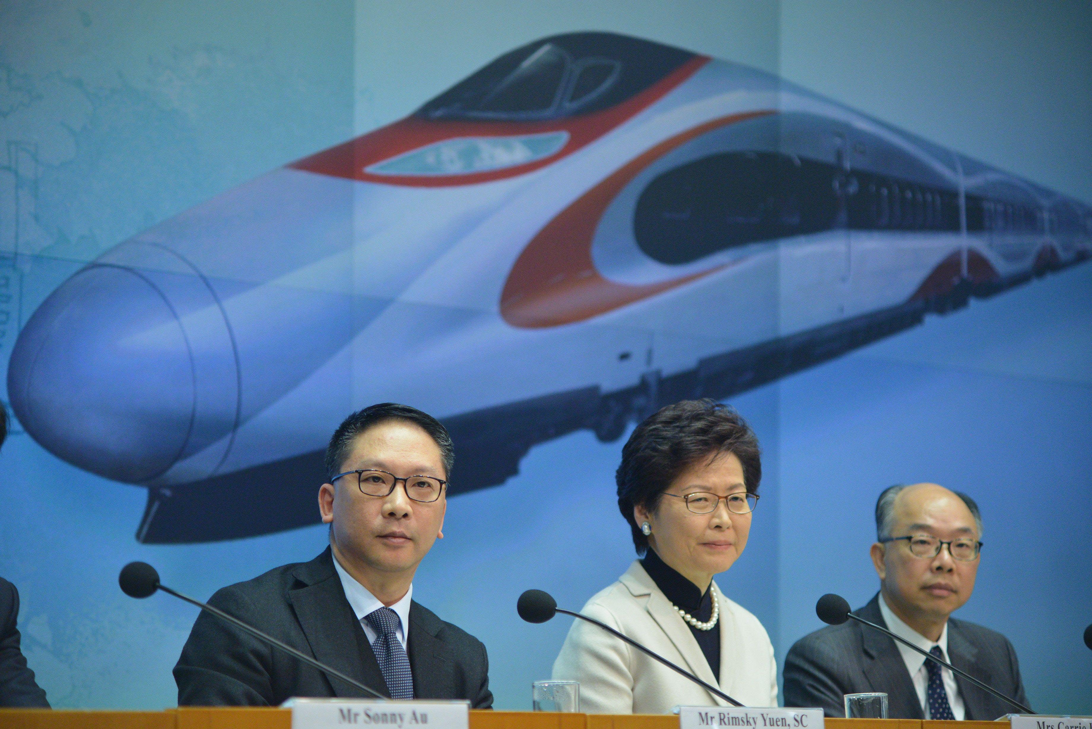在北京昨午4時舉行記者會後,林鄭月娥與律政司司長袁國強、運輸及房屋局局長陳帆和署理保安局局長區志光,於下午6時在政府總部舉行了記者會。 林鄭指出,目前高鐵香港段的工程完成近98%,預期通車後每天達10萬客次,如果拖延的話,每日都損害香港市民利益。她衷心期望立法會議員能夠以務實、理性的態度,審議有關條例草案。