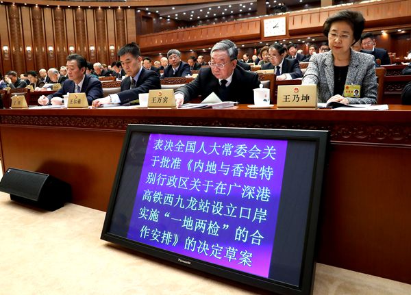 昨日,十二屆全國人大常委會第三十一次會議,以158票贊成全票通過了廣深港高鐵西九龍站「一地兩檢」合作安排的決定。中新社