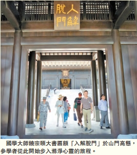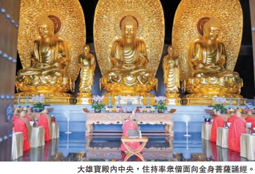 當日,慈山寺正值法會活動,主佛殿區的第一大殿「大雄寶殿」傳出陣陣誦經繞梁不絕,參學者循其聲至寶殿外,所見眾善信踴躍捐香油,而於殿內中央住持率眾僧誦經,左側殿眾善信身著海青縵衣,右側殿市民和游客聆聽誦經,數小時后,著朱紅袈裟僧侶、海青縵衣的善信在主持率領下行於普門誦經,在餘暉映照下的朱紅袈裟、海青縵衣在木啡色建築襯托之下顯得格外迷幻。