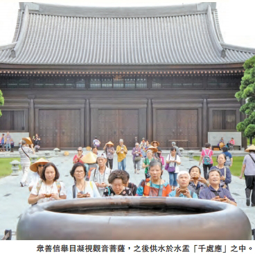 由台灣慕名而至的謝姓善信表示,與親友來香港數天參加禪學交流活動,於網上預約后前來參拜,以平靜之心「净」心。他與親友先於普門一側供水處取出水缽,於取水池中取水於水缽中,然后,手托水缽,沿着普門寺廟后的一條筆直慈悲道,一步一趨地朝着背山面海的觀音聖像行進,沿路兩旁高大的古羅漢松在眾善信身后移動。當他們接近觀音聖像時,於聖像前的一尊青銅制水盂「千處應」前駐足,各位舉目凝視聖像,而觀音頭部微微低垂,俯瞰善信,觀音倒影於水盂中呈現,善信將水缽水輕入水盂中,以珍貴的清净心入禮物,供養觀音菩薩,此刻,水盂泛起陣陣漣漪,觀音倒影於水波忽隱忽現,之后,有更多善信供水於「千處應」水盂。