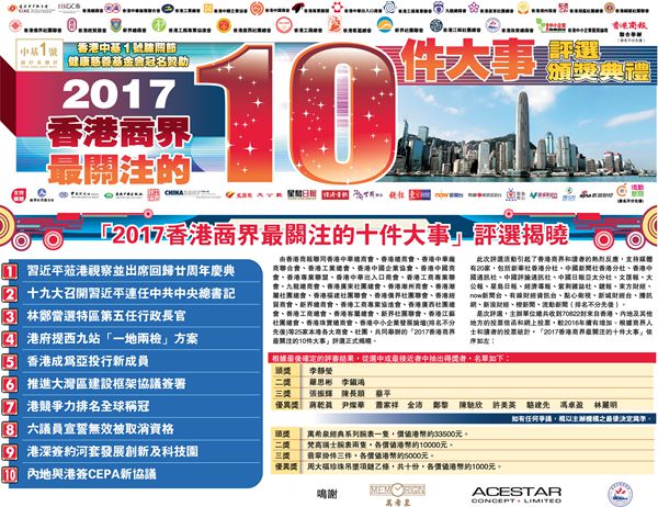 【香港商报网讯】由香港商報聯同香港中華總商會、香港總商會、香港中華廠商聯合會、香港工業總會、香港中國企業協會、香港中國商會、香港專業聯盟、香港中華出入口商會、香港工商專業聯會、九龍總商會、香港廣東社團總會、香港潮州商會、香港潮屬社團總會、香港福建社團聯會、香港僑界社團聯會、香港經貿商會、新界總商會、香港工商專業協進會、香港廣西社團總會、香港工商總會、香港客屬總會、新界社團聯會、香港江蘇社團總會、香港珠寶總商會、香港中小企業發展論壇(排名不分先後)等25家本港各大商會、社團,共同舉辦的「2017香港商界最關注的10件大事」評選正式揭曉。