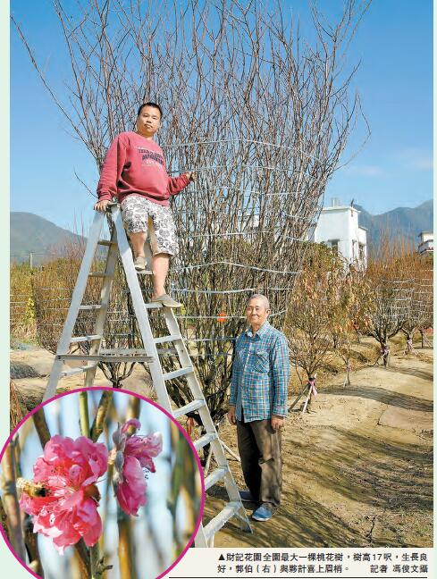 林錦公路旁的「財記花園」遍地桃花,園主郭財添表示,舊年全年天氣對桃花生長有利,夏日氣溫不算最高,現時進入催花期,桃花喜凍,氣溫下降至10度左右時,相信600多棵桃花生長良好,豐收在望。現時,種植期在5年的桃花數量有近20棵,其中一棵堪稱王的桃花已被大客戶以數萬元訂購,它的樹幹至樹枝高度達17呎,樹枝圍邊最大直徑約9呎,即使兩個成年人手牽手也未必可以抱住。