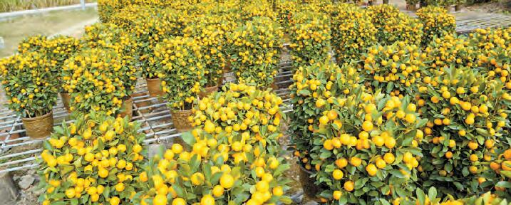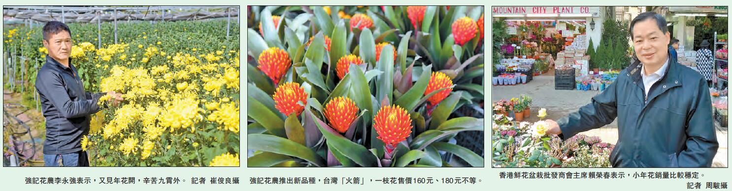 在林村(大菴路段)的強記花園以年花品種繁多、銷量強著稱,園主李永強表示,距離農曆新年還有10多天,不到最後一刻,都不敢講年花大豐收,但對比舊年全年,今年年花生長可講滿意,每年天氣都有突變時,也是預料之中的,8號、10號颱風損失不算多。去歲強記不同品種年花銷量達10萬枝,今個農曆年供應量增加一成半,應市菊、桔、劍蘭等年花逾10萬枝。李表示,客源只會有多無少,熟客佔約八、九成,新客佔約一成多;售價方面,熟客按舊價,新客按新價。他又介紹,今年再推出一批新品種,其中,特別由台灣引進紅似火的亞熱帶森林地區「火箭」盆栽,經過人工改良,每盆售價160元至180元不等,另由南美智利引進百合新品種「巨星」,開花特徵是大而靚,在本港種花幾十年的老行家以及兩代插花的人士均稱沒有看過這個花品,現時的生長則要靠「老天爺」,有陽光照射,百合產量會高些,繼續陰天產量會少些。