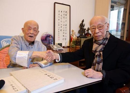 国学大师饶宗颐一生政学严谨,与季羡林并称「北季南饒」;。图为饶宗颐于2008年到北京探访季羡林。