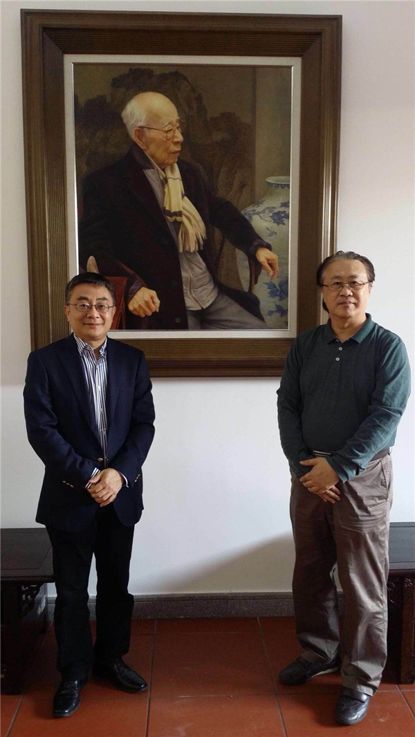 吴秋文介绍著名画家深圳大学教授刘声雨为饶公造像,画作挂于学院大厅。