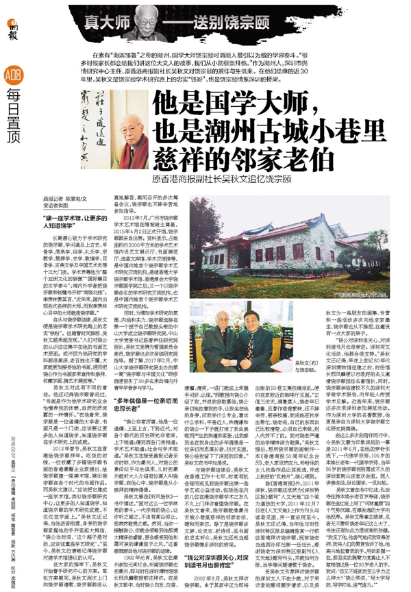 在素有“海滨邹鲁”之称的潮州,国学大师饶宗颐可谓潮人最引以为傲的学界泰斗。“很多时候家长都会给我们讲这位大文人的故事,我们从小就很崇拜他。”作为潮州人,深圳市舆情研究中心主任、香港商报原副社长吴秋文对饶宗颐的景仰与生俱来。在他们结缘的近30年里,吴秋文是饶宗颐学术研究路上的忠实“铁粉”,也是饶宗颐情系深圳的桥梁。