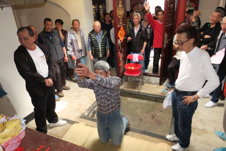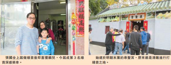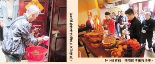 正月初五(2月20日)上午10時,平日較寂靜的八鄉元崗村眾聖宮,聚集數十村民,個個以柚葉水「洗手」,并誠心跪於神像前,祈求好運獲上天眷顧,能連續擲出多個勝杯,成為元崗村年底舉行太平清醮期間的緣首。緣首是結緣之首,代表村民通上天,結果擲杯最多的首3名村民,上屆打醮俱是緣首,有人在8年間喜獲麟兒、做生意蒸蒸日上!香港商報記者 鄭玉君