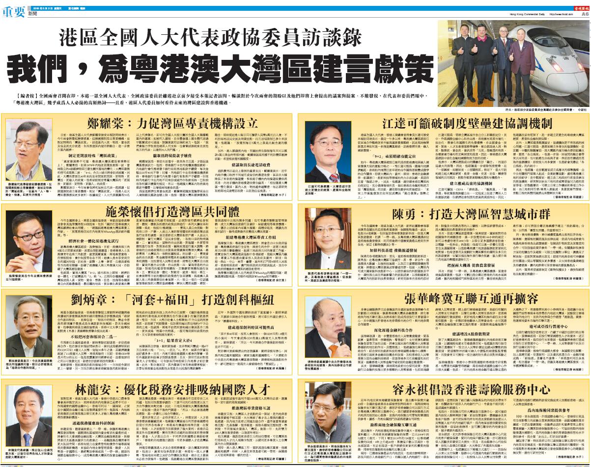 【編者按】全國兩會召開在即,本港一眾全國人大代表、全國政協委員於離港赴京前夕接受本報記者訪問,暢談對於今次兩會的期盼以及他們即將上會提出的議案與提案。不難發現,在代表和委員們眼中,「粵港澳大灣區」幾乎成為人人必提的高頻熱詞——且看,港區人代委員如何看待未來的灣區建設與香港機遇。