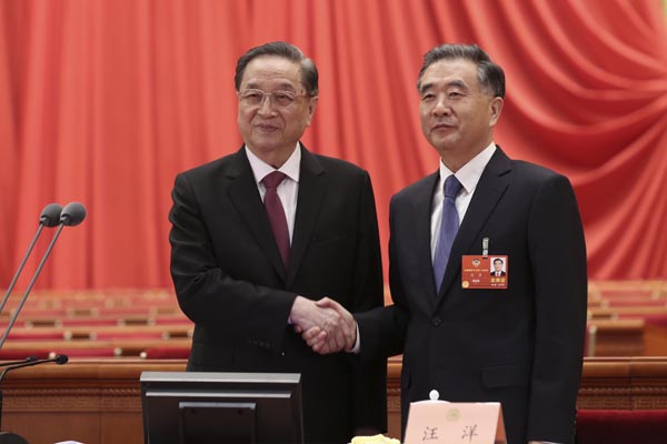 昨日,政協第十三屆全國委員會第一次會議舉行預備會議。政協十三屆一次會議主席團會議主持人汪洋同十二屆全國政協主席俞正聲握手。中新社