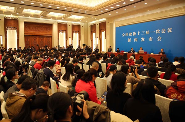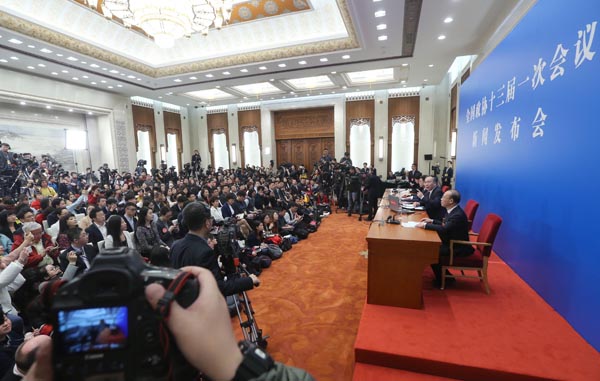 全國政協十三屆一次會議首場新聞發布會昨日在北京人民大會堂舉行,大會新聞發言人王國慶介紹會議有關情 况并回答中外記者提問。新華社