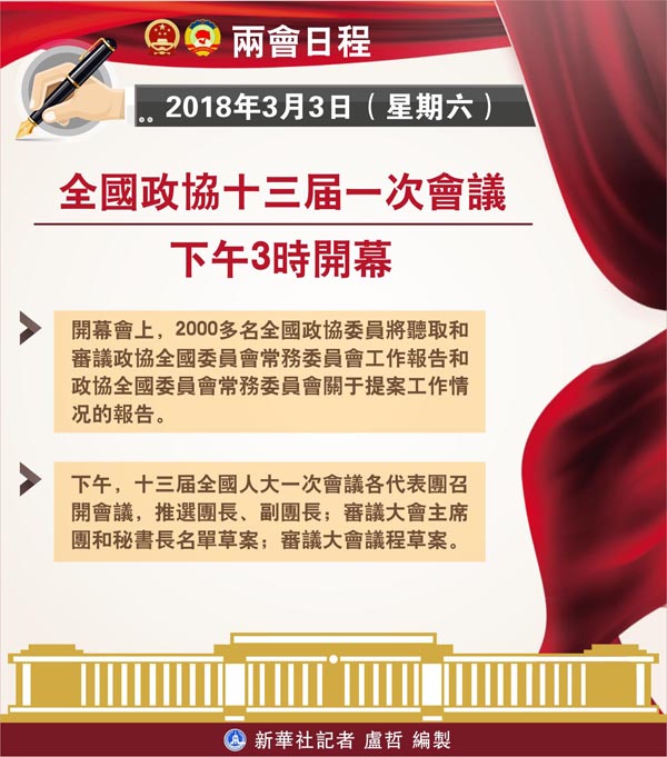 王國慶介紹,大會主要議程是,聽取和審議全國政協常委會工作報告和關於提案工作情况的報告;列席十三屆全國人大一次會議,聽取并討論政府工作報告及其他有關報告,討論憲法修正案草案和監察法草案等;審議通過中國人民政治協商會議章程修正案、政協十三屆一次會議政治決議等決議和報告;選舉政協第十三屆全國委員會主席、副主席、秘書長和常務委員。
