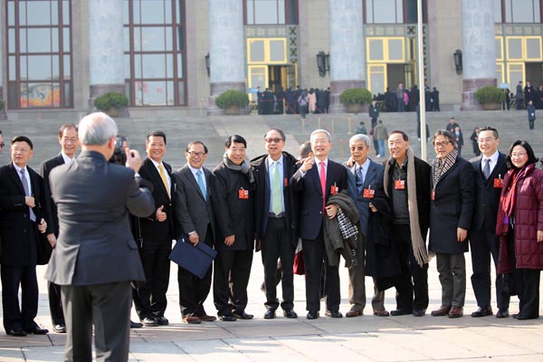 3月2日,港區全國政協委員抵達北京人民大會堂出席預備會議。圖為港區全國政協委員在人民大會堂前合影。 中新社