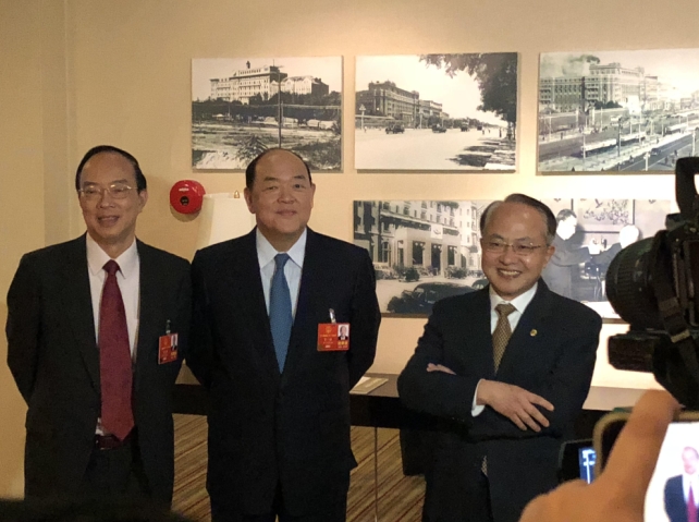 右起中聯辦主任王志民、澳門立法會主席賀一誠、港區全國人大代表團團長馬逢國在會後接受記者採訪。